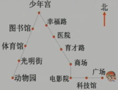 從廣場出發向 行駛 站到電影院,再向 行駛 到站到商場 ,再向