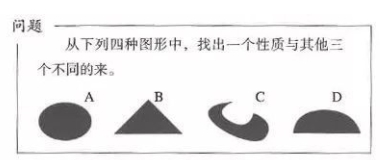 不過,也許有人會選擇圖形C。因為非對稱性圖形只有C一個,所以C會被認為與其他圖形不同。確實如此,這也是正確答案。答A也是可以的。因為A是唯一沒有角的圖形,所以A也是正確答案。那么,D又怎樣呢?這是唯一一個由直線與曲線構成的圖形,因此D也是正確答案。換句話說,由于看圖形的角度不同,四種答案全都正確。