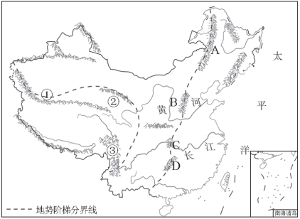 讀我國地勢三級階梯示意圖,完成7~8題。