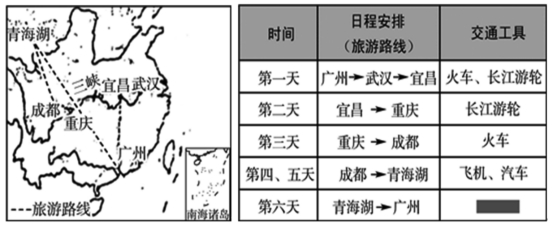 1.“十一”黃金周是旅游的旺季,下面是廣州某中學生“十一”期間隨旅行團的旅游路線圖和日程安排表。讀圖表資料,完成下列各題。